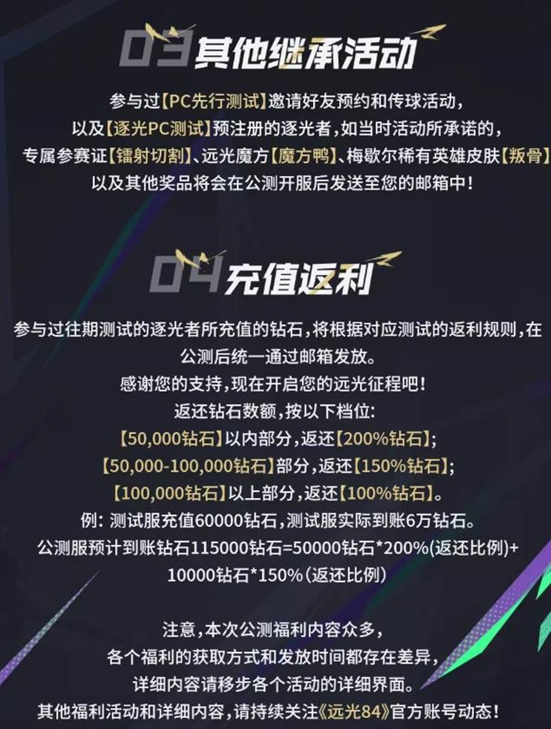 参与过往期测试的逐光者所充值的钻石,将根据对应测试的返利规则,在公测后统一通过邮箱发放。感谢您的支持,现在开启您的远光征程吧!