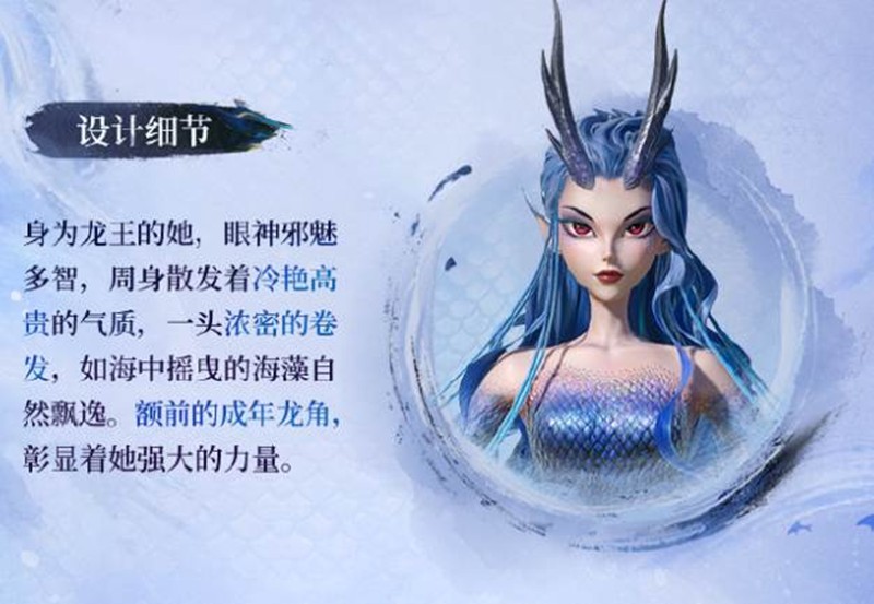 身为龙王的敖闰,眼神邪魅多智,周身散发着冷艳高贵的气质。一头浓密的卷发,如海中摇曳的海藻自然飘逸。额前的成年龙角,彰显着她强大的力量。皮肤表层的鳞片,透着冷峻的质感。