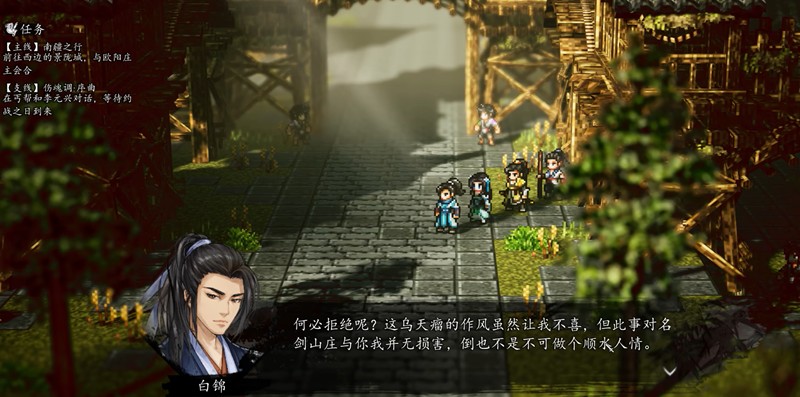 在谭城会自动触发谭城血案任务,建议带上叶飞和吕仙儿这两个伙伴。开始任务前需要先清空谭城的其他任务。过完谭城门口的剧情后,前往丐帮总舵对话,然后向右走找到李元兴。此时要注意不要直接与李元兴对话,否则任务会直接结束。