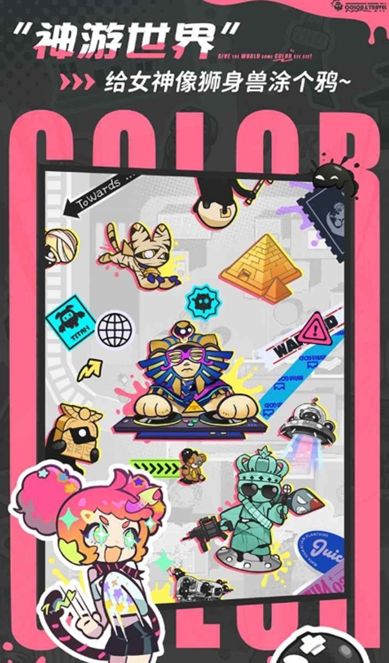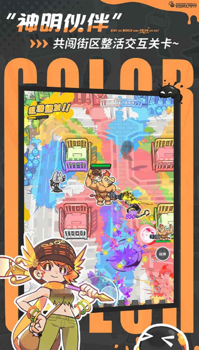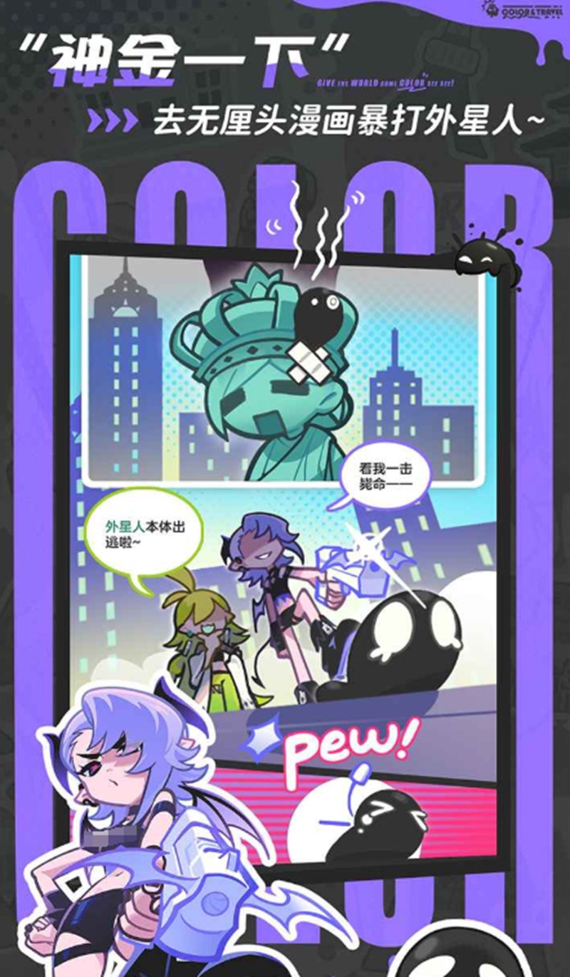 乱涂彩世界的故事背景设定在被黑白外星生物酷吉侵蚀的世界,神明与恶魔们为了夺回色彩而踏上征程。从游戏剧情到角色对话,处处充满搞笑元素和玩梗设计,让玩家在紧张刺激的战斗之余也能感受到轻松愉悦的氛围。