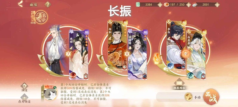 主力:白居易(重蕴承佑套)、李白(重蕴文曲套)、郑和(仅重蕴一些防御输出词条的姑射套)、班昭(未重蕴20级姑射套)