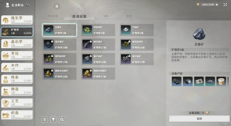 矿物学采集的矿石主要分为巴鲁矿、阿兹特矿、卢纳矿等多个种类。这些矿石可以加工成精炼石、辅材等不同类型的材料。精炼石是制作高级装备的关键原料,而辅材则能提升制作效果和材料产出。不同区域的矿石分布也各有特色,比如阿斯特里亚平原盛产巴鲁矿和阿兹特矿,风啸峡谷则是富斯托克矿的主要产地。