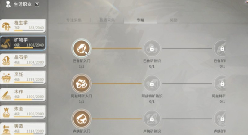 矿物学还提供了专精系统供玩家选择。专精方向包括精炼石采集和矿物增产技术两大类。选择"挖矿增产技术"专精可以显著提升采集效率,而特定矿石的专精则能帮助玩家获取更高质量的矿物资源。这些专精选择会直接影响玩家的采集收益和后续发展路线。