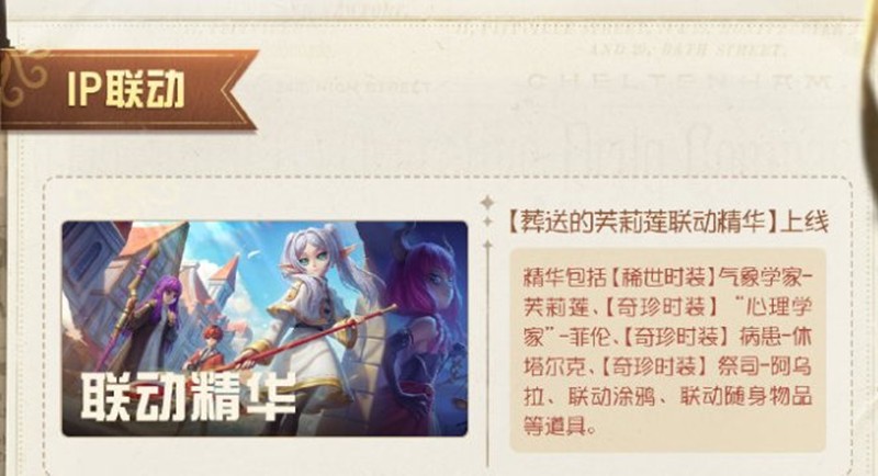 本次联动活动中,精华包括【稀世时装】气象学家-芙莉莲、【奇珍时装】“心理学家”-菲伦、【奇珍时装】病患-休塔尔克、【奇珍时装】祭司-阿乌拉、联动涂鸦、联动随身物品等道具。