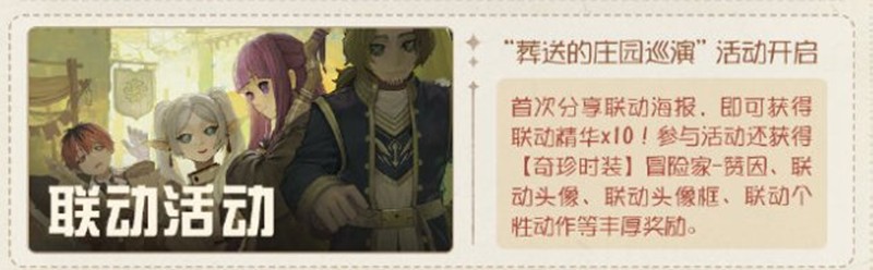 “葬送的庄园巡演”活动开启:首次分享联动海报,即可获得联动精华x10!参与活动还可获得【奇珍时装】冒险家-赞因、联动头像、联动头像框、联动个性动作等丰厚奖励。