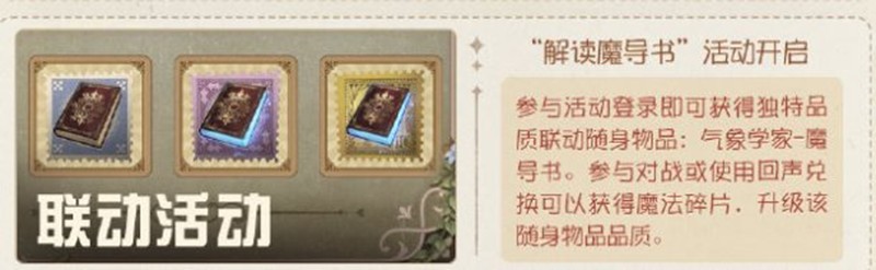 “解读魔导书”活动开启:参与活动登录即可获得独特品质联动随身物品:气象学家-魔导书。参与对战或使用回声兑换可以获得魔法碎片,升级该随身物品品质。