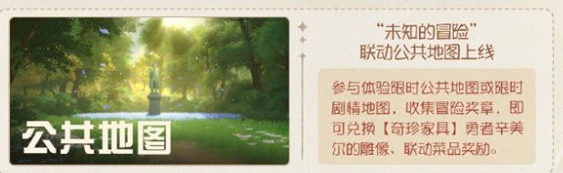“未知的冒险”联动公共地图上线:参与体验限时公共地图或限时剧情地图,收集冒险奖章,即可兑换【奇珍家具】勇者辛美尔的雕像、联动菜品奖励。