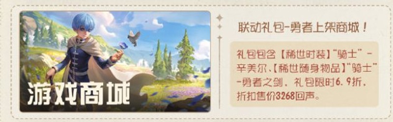 联动礼包-勇者上架商城!礼包包含【稀世时装】“骑士”-辛美尔、【稀世随身物品】“骑士”-勇者之剑,礼包限时6.9折,折扣售价3268回声。