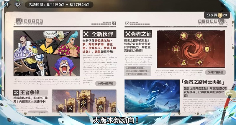 活动内容:围绕罗的主题活动「心之领域」即将来袭,包括强者之证、强者之路等常驻活动,为玩家提供更多的挑战和奖励。