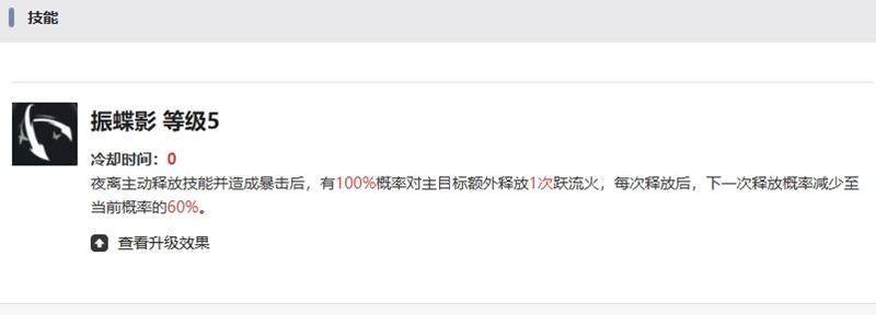 夜离的首个技能跃流火能够对敌方单体造成240%的高额伤害,并有概率偷取敌方增益效果。随着技能等级提升,伤害系数和偷取概率都会得到显著增强。被动技能振蝶影则提供了强大的连击机制,在暴击后可以追加攻击,形成连续打击的效果。