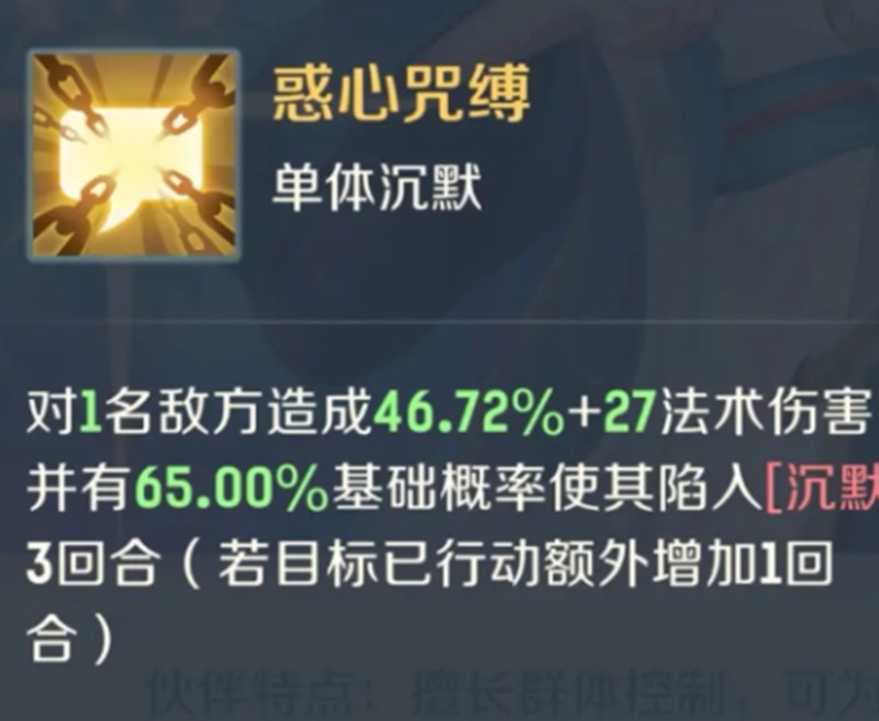 惑心咒缚是镇元子的单体控制技能。能对目标造成46.72%的法术伤害,并有65%几率使目标沉默三个回合。这个技能专门针对敌方核心角色,能有效限制敌方治疗或法师的关键技能释放。在对抗高爆发法师时尤为有效,能化解致命威胁。
