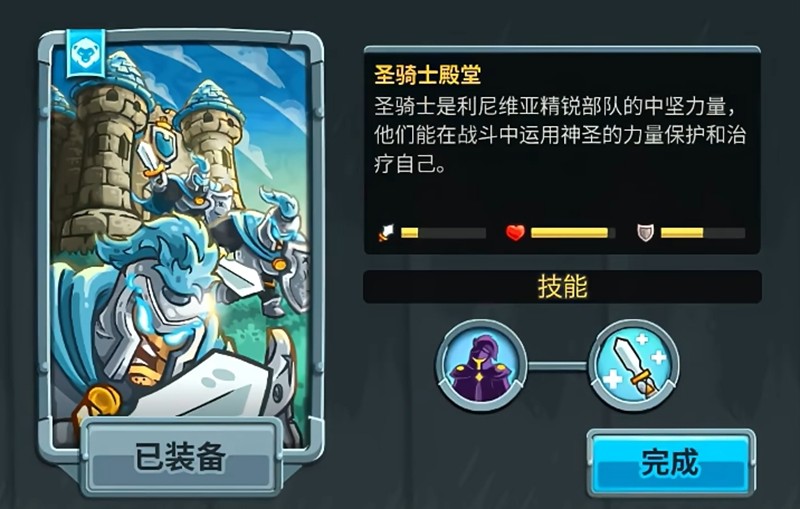 这座防御塔拥有两个实用技能。身先士卒技能可以召唤更强大的圣骑士,不仅继承原有属性,还能为附近友军提供20%攻击加成。治愈祷告则让骑士在血量低于25%时进入无敌状态并持续回血,三级技能甚至能让骑士回满血量,这个效果每次复活后都会刷新。