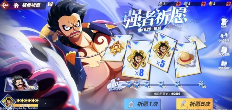 首先是祈愿活动,在航海王热血航线的强者祈愿活动中,船长们可以找到四档路飞的身影。这次活动同时推出了四档路飞和弗拉门戈两位新角色,船长需要在祈愿界面选择路飞作为目标角色。通过消耗秘钥进行祈愿,就有机会获得四档路飞的碎片。