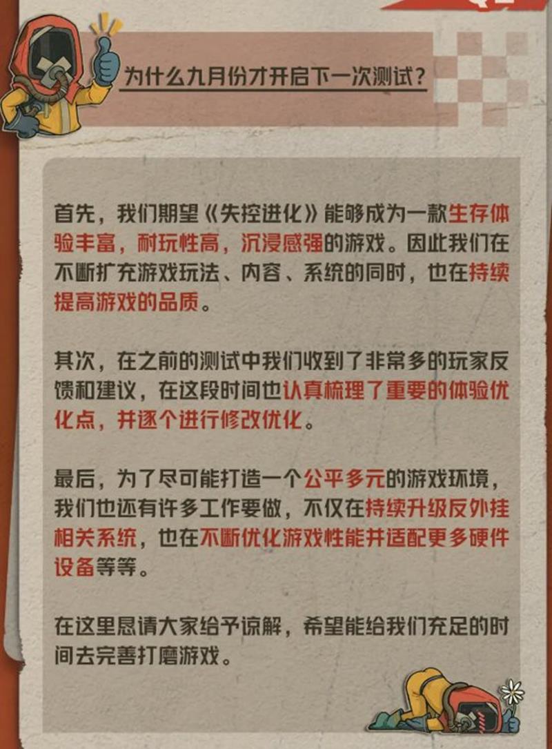 首先,我们期望《失控进化》能够成为一款生存体验丰富,耐玩性高,沉浸感强的游戏。因此在不断扩充游戏玩法、内容、系统的同时,也在持续提高游戏的品质。其次,在之前的测试中我们收到了非常多的玩家反馈和建议,在这段时间也认真梳理了重要的体验优化点,并逐个进行修改优化。最后,为了尽可能打造一个公平多元的游戏环境,我们也还有许多工作要做,不仅在持续升级反外挂相关系统,也在不断优化游戏性能并适配更多硬件设备等等。