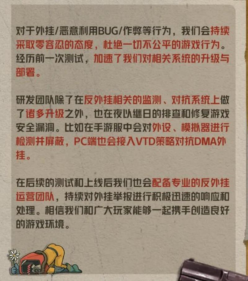 对于外挂/恶意利用BUG/作弊等行为,我们会持续采取零容忍的态度,杜绝一切不公平的游戏行为。经历前一次测试,加速了我们对相关系统的升级与部署。研发团队除了在反外挂相关的监测、对抗系统上做了诸多升级之外,也在夜以继日的排查和修复游戏安全漏洞。比如在手游服中会对外设、模拟器进行检测并屏蔽,PC端也会接入VTD策略对抗DMA外挂。在后续的测试和上线后我们也会配备专业的反外挂运营团队,持续对外挂举报进行积极迅速的响应和处理。相信我们和广大玩家能够一起携手创造良好的游戏环境。