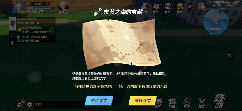首先这个任务与东蓝之海的宝藏有关,藏宝图提示需要在蓝色双子巨塔的塔下阴影处寻找宝藏。