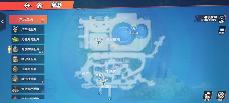 蓝色双子巨塔位于东蓝之海区域的谢尔兹镇近海地图中。如果玩家尚未解锁该地图,需要先完成前置条件才能前往。到达谢尔兹镇近海后,往右上角的海军基地方向前进,就能看到标志性的蓝色双子巨塔建筑。