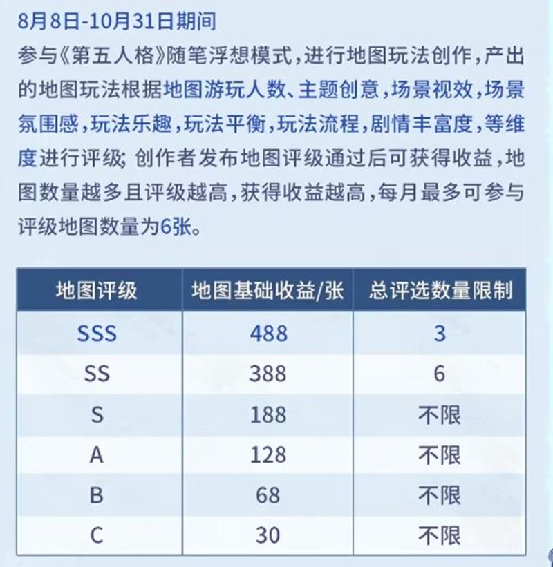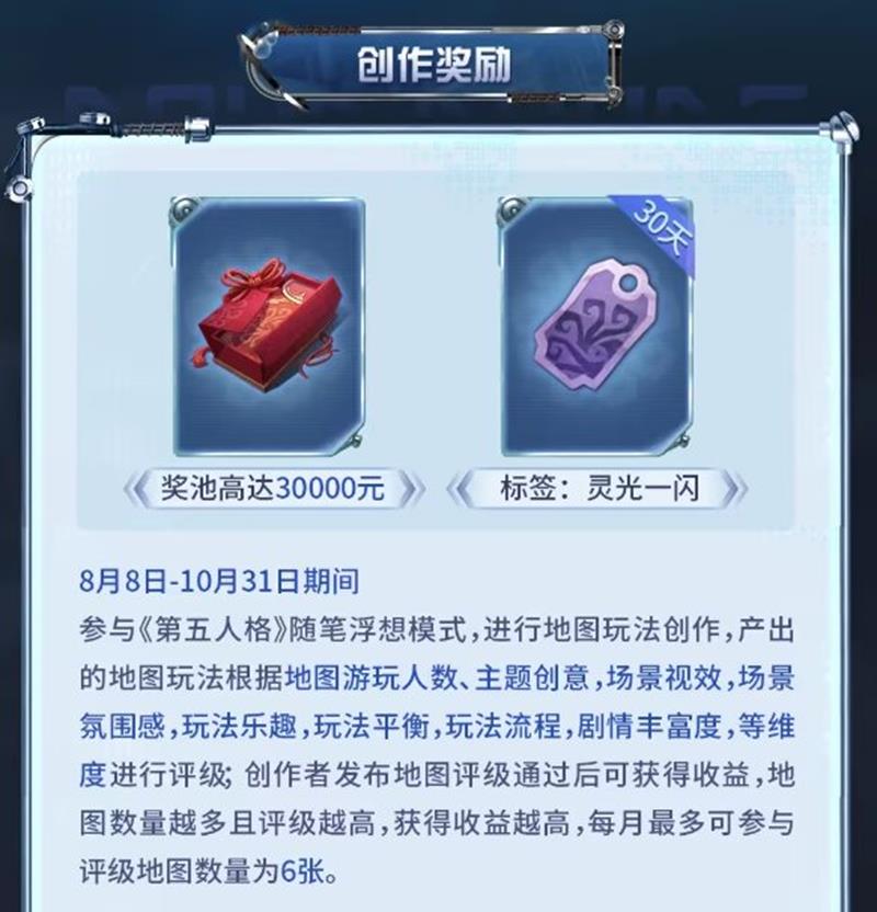活动期间,玩家可以参与《第五人格》随笔浮想模式,进行地图玩法创作。地图将根据游玩人数、主题创意、场景视效、场景氛围感、玩法乐趣、玩法平衡、玩法流程、剧情丰富度等维度进行评级。评级越高,获得的收益越高。每月最多可参与评级地图数量为6张。