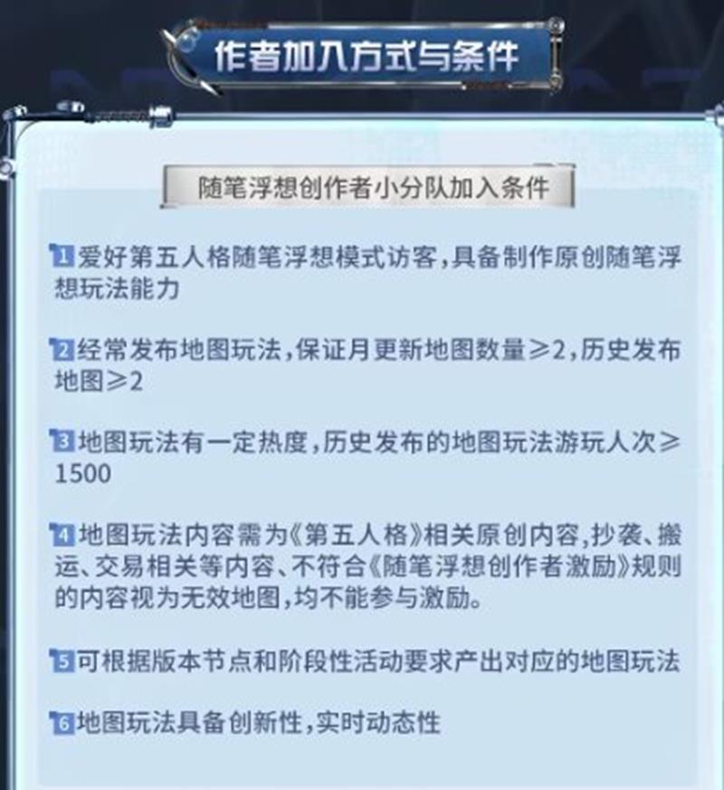 地图玩法内容需为《第五人格》相关原创内容,抄袭、搬运、交易相关内容,不符合《随笔浮想创作者激励》规则的内容视为无效地图,均不能参与激励。