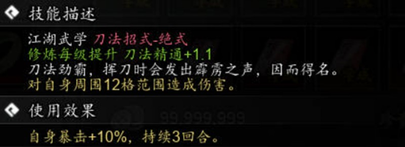 霹雳霸刀的攻击范围覆盖角色周围12格区域,基础攻击力高达405点,每次施展需要消耗392点真气,冷却时间为4回合。使用技能后能够提升自身10%暴击率,效果持续3回合,这个增益效果可以显著提升角色的整体输出能力。