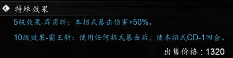 当霹雳霸刀提升到5级时,会解锁"霹雳斩"效果,暴击伤害额外增加50%。这个强化效果让暴击时的伤害输出达到惊人的程度。技能达到10级后解锁"霸王斩"效果,每当其他招式触发暴击时,霹雳霸刀的冷却时间会减少1回合,这个机制大大提高了技能的实战价值。