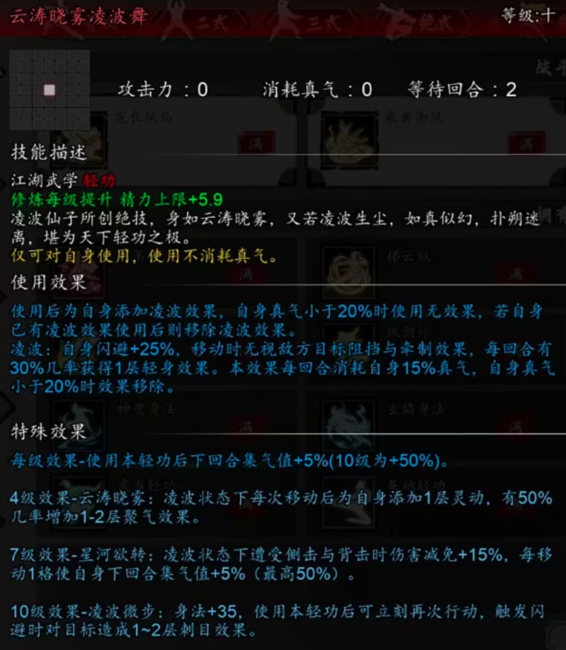 云涛晓雾凌波舞是一款江湖武学轻功,其最大特点是不消耗真气值。使用后可获得凌波效果,但需要玩家保持20%以上的真气值才能触发。该轻功能在下回合提升50%集气值,被动效果可增加35点身法属性。战斗中还能给目标叠加刺目效果,每层降低敌方3%命中率,最多可叠加9层。