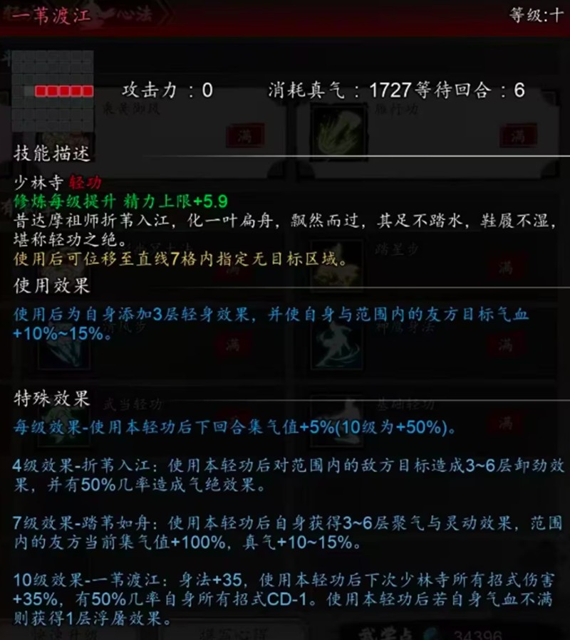 一苇渡江是少林寺的招牌轻功,使用后可直线位移7格距离。该技能同样能提升50%集气值,并叠加3层轻身效果。聚气与灵动技能可叠加3-6层,还能为范围内队友恢复10-15%气血值,在持久战中表现突出。