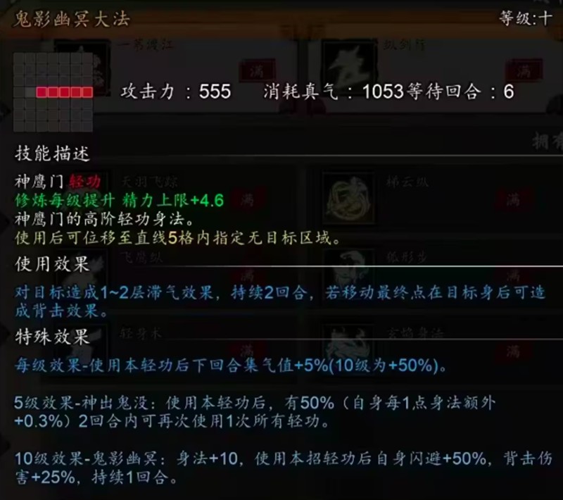 神鹰门的鬼影幽冥大法可直线移动5格距离,同样具备提升集气值的效果。该轻功可对范围内敌人施加置气效果,降低其5%集气速率。虽然闪避能力提升50%,但被击伤害也会增加25%,属于攻守兼备的轻功选择。