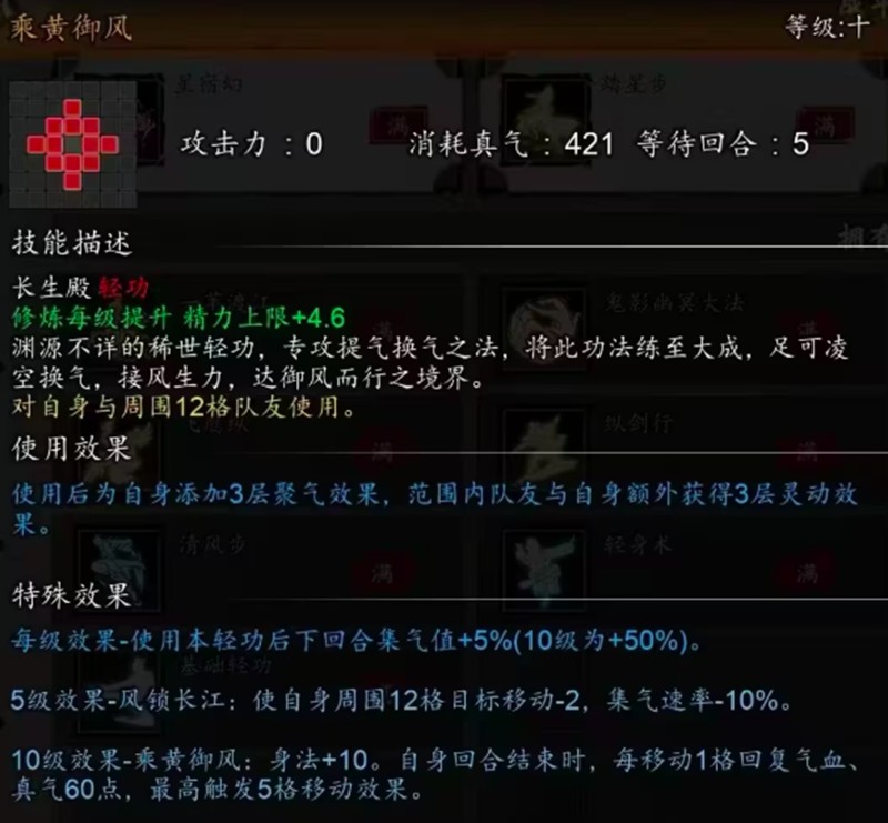 长生殿的乘黄御风轻功不仅能提升自身5%集气速度,还能为周围队友提供3层灵动效果。其被动技能风锁长江可降低敌人移动力和集气速率,在团队作战中能发挥重要作用。