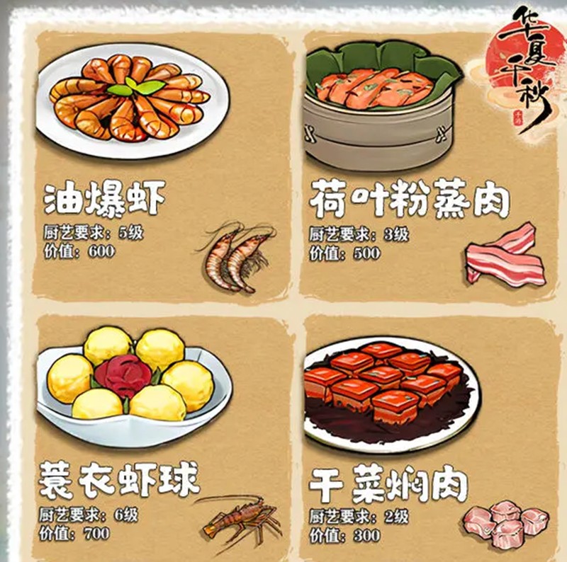 油爆虾需要厨艺5级才能制作,价值高达600,是前期收益较高的菜品。荷叶粉蒸肉价值500,干菜焖肉价值300但只需要厨艺2级,适合新手玩家。八宝童鸡作为价值900的高级菜品,是后期必学的菜谱之一。其他热门菜品还包括虾仁猪心汤、葱爆牛肉和干锅土豆虾等。