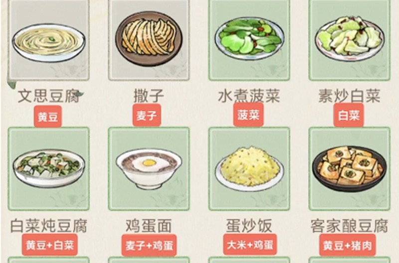 米糕只需要大米就能制作,是最基础的主食。千层糕需要麦子和白糖,咸豆腐脑需要黄豆和卤水。黄金开口笑、肉夹馍等小吃则需要更多食材组合。煎蛋虾饺、驴打滚等特色小吃也是值得收集的菜谱。