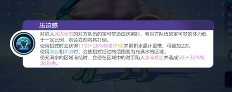 水君的特性"压迫感"极具威胁性。当敌方宝可梦被冰冻且血量低于特定比例时,水君可以直接将其击倒。同时使用技能还能获得护盾效果,大大提升了生存能力。这个特性让水君既能追击残血敌人,又能保护队友,在团队作战中发挥重要作用。