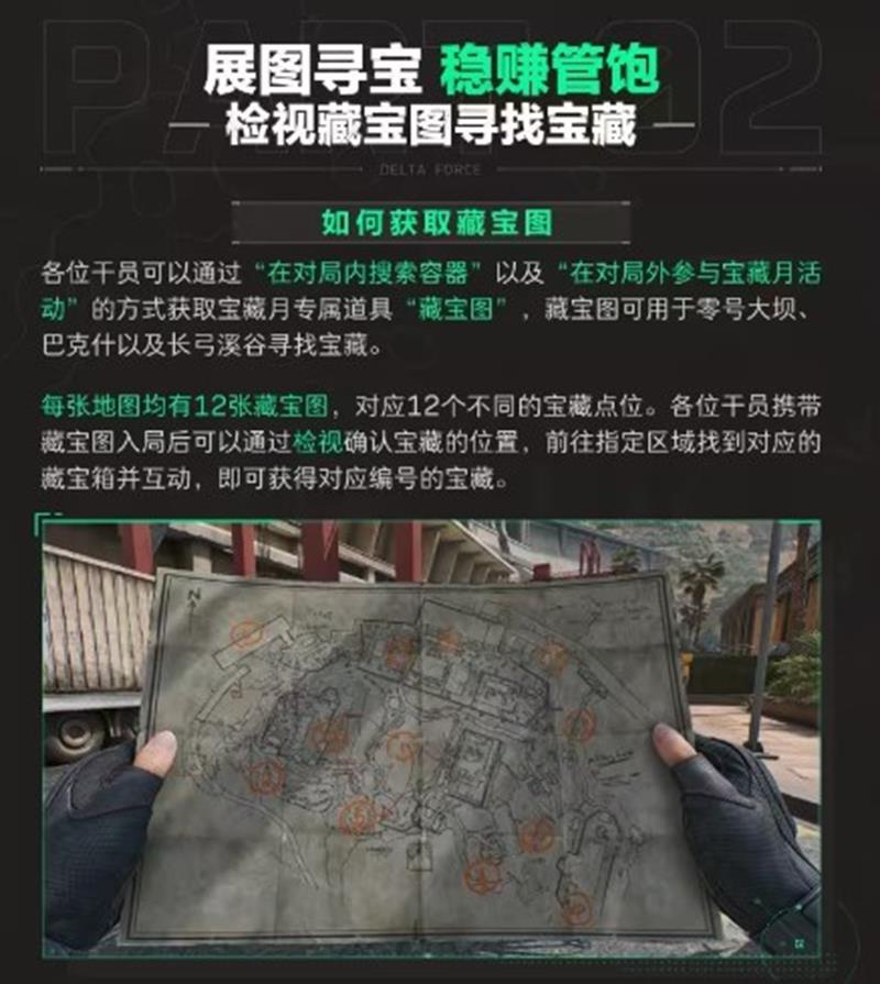 各位干员可以通过“在对局内搜索容器”以及“在对局外参与宝藏月活动”的方式获取宝藏月专属道具“藏宝图”。藏宝图可用于零号大坝、巴克什以及长弓溪谷寻找宝藏。预祝各位干员在宝藏月收获满满!