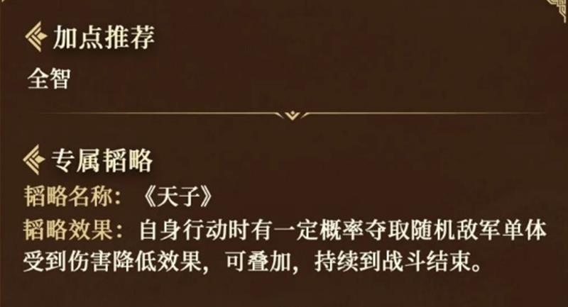 曹丕的核心能力体现在他的指挥技上,战斗开始时可以随机夺取敌方两名武将的伤害减免效果。这个技能在面对高防御阵容时特别有效,能够显著削弱敌方的生存能力。同时该技能还会为我方先攻值最低的武将附加九锡状态,进一步夺取被点名敌人的智力属性,在谋略型队伍中能发挥重要作用。