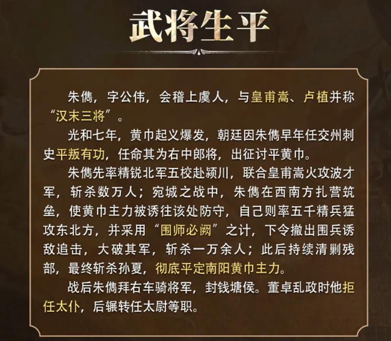 三国谋定天下中的朱儁是一位极具特色的谋略型武将,作为东汉末年平定黄巾之乱的重要将领,朱儁在游戏中完美还原了其智勇双全的特点,那么三国谋定天下朱儁有什么技能?下面我们就来看看这位武将的具体能力。