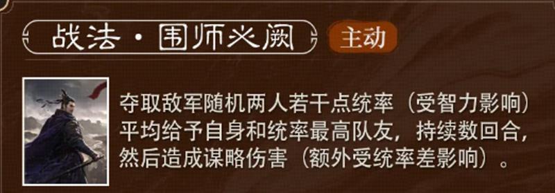 朱儁的核心战法"围师必阙"充分展现了他的谋略才能。这个技能可以随机夺取敌方两名武将的统率值,夺取数值与朱儁的智力属性直接相关。夺取的统率值不仅能提升朱儁自身的作战能力,还能与队伍中统率最高的队友共享,持续多个回合。在战斗结束时,这个技能还会对敌人造成额外的谋略伤害,形成攻防一体的战术优势。