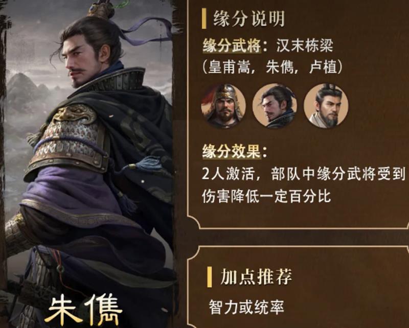 在武将缘分方面,朱儁与皇甫嵩、卢植组成的阵容能激活特殊效果。当这三位历史名将同时上阵时,队伍中所有缘分武将受到的伤害都会有所降低。这个减伤效果在持久战中尤为重要,能显著提升整个队伍的生存能力。