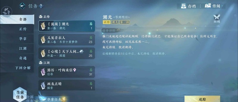 把剧情过到“去神侯府找无情”后面会提示你剧情要第二日开启,这时候去做流派任务,看见有流派两个字就点追踪!这任务就一分钟的剧情,现在你有32级了!