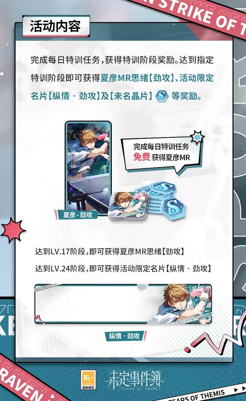 活动期间,律师可通过选择不同的「提供补给」方案完成每日特训任务,获得特训阶段奖励。达到指定特训阶段即可获得夏彦MR思绪【劲攻】、活动限定名片【纵情 · 劲攻】及【未名晶片】等奖励