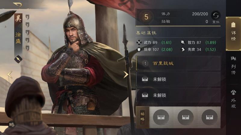 徐盛在三国谋定天下中定位为防御型武将,拥有107点的高统帅值。他的主动技能"百里疑城"在战斗前4回合内,能为全体友军提供12.5%-25%概率的抵御效果,这个概率会随着统率属性提升而增加。第四回合开始时,徐盛自身统率将提升20-40点,同时给敌方全体施加持续2回合的洪水状态。