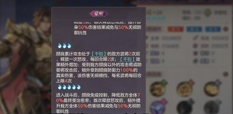 觉醒后的颜良能力得到全面提升,通过多次释放怒气技能可以叠加伤害加成和减伤效果,使他在战场上越战越勇。在羁绊方面,颜良与防御型武将搭配时能够提升全队免伤效果,同时增强自身的防御和输出能力,这种特性让他成为团队中的核心防御力量。