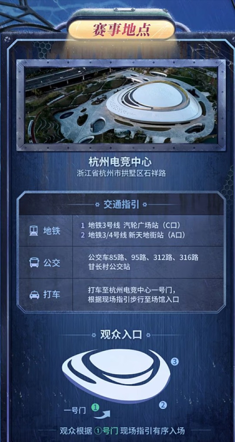 赛事地点:杭州电竞中心,浙江省杭州市拱墅区石祥路