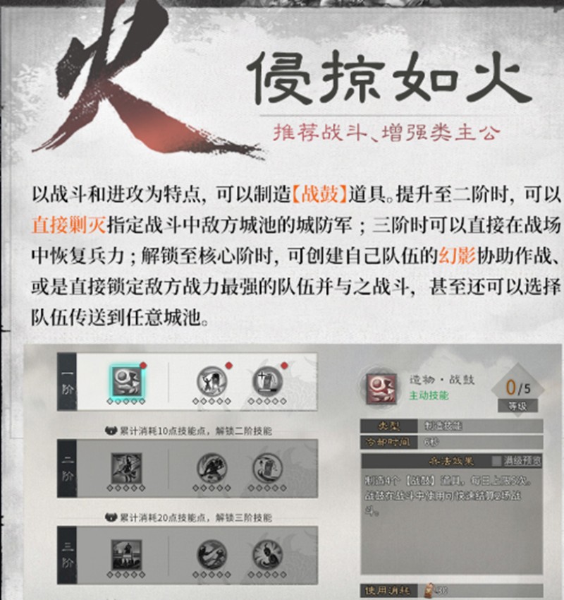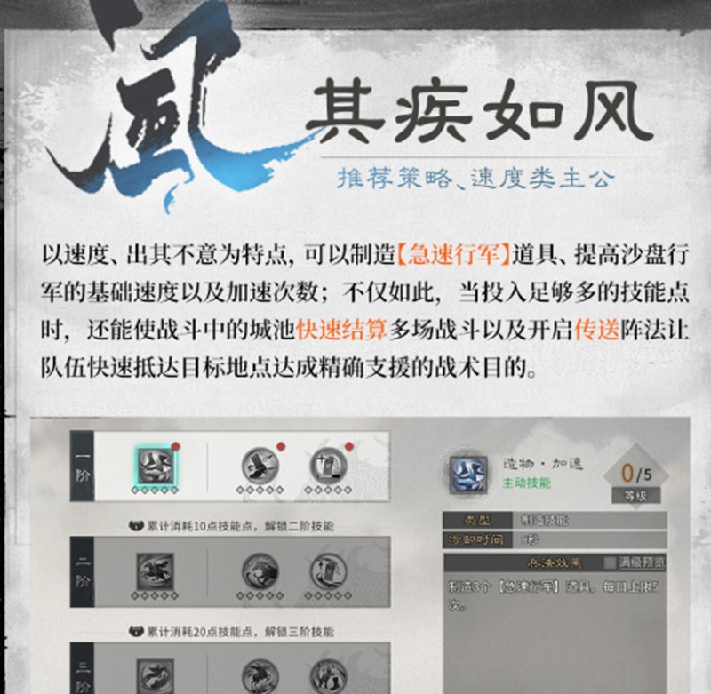 侵掠如火是骑兵突击战术的核心兵法。通过制作攻击道具削弱敌方防御,在解锁兵力后能实现分列队伍和跨城传送。这个兵法特别适合应对多股敌军,能快速完成跨城突袭作战。