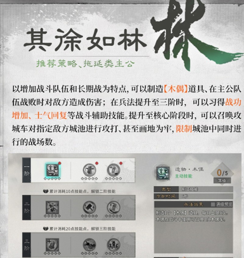 徐如林专注于战车强化和战场控制。它能制造牵制道具阻碍敌军行动,后期还能解锁辅助效果增加并行战场数量。在攻城战中,这个兵法能延缓敌方援军推进速度,为主力部队争取宝贵时间。
