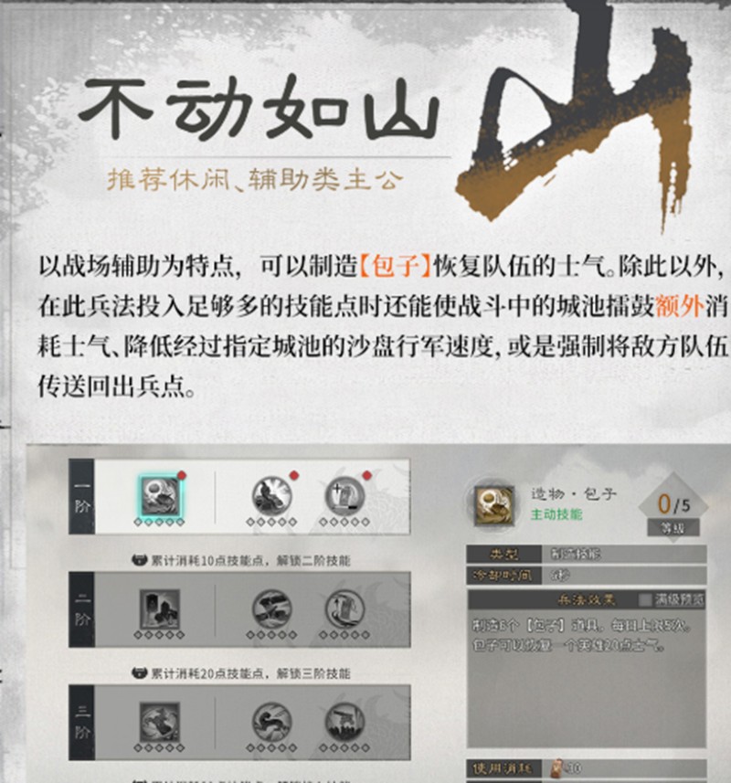 不动如山是阵地防御的专家兵法。它能恢复士气、降低敌军速度并限制传送,在关键城池布置时能有效维持防线韧性。减速效果还能影响敌军的攻击节奏,为防守方创造优势。