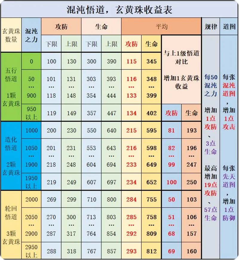 答:玄黄珠主要用于混元悟道系统。消耗玄黄珠可以进行五行悟道,获得攻击、防御和生命值的基础属性提升。第一次使用玄黄珠时,还能额外获得混沌之力、混沌道图、先天道图等收益。随着修为提升,还能解锁造化悟道和轮回悟道,带来更大幅度的属性加成。