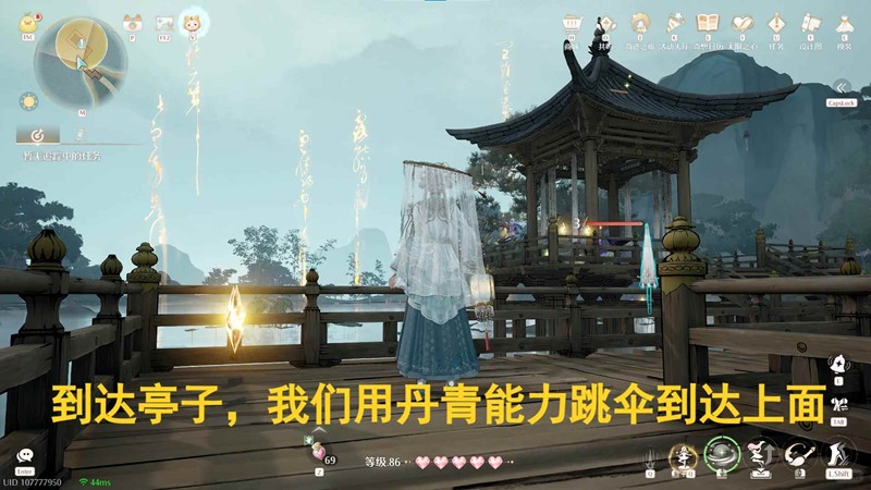 跟随指引,到达任务地点,用丹青能力跳上伞到达屋顶,带走画卷;
