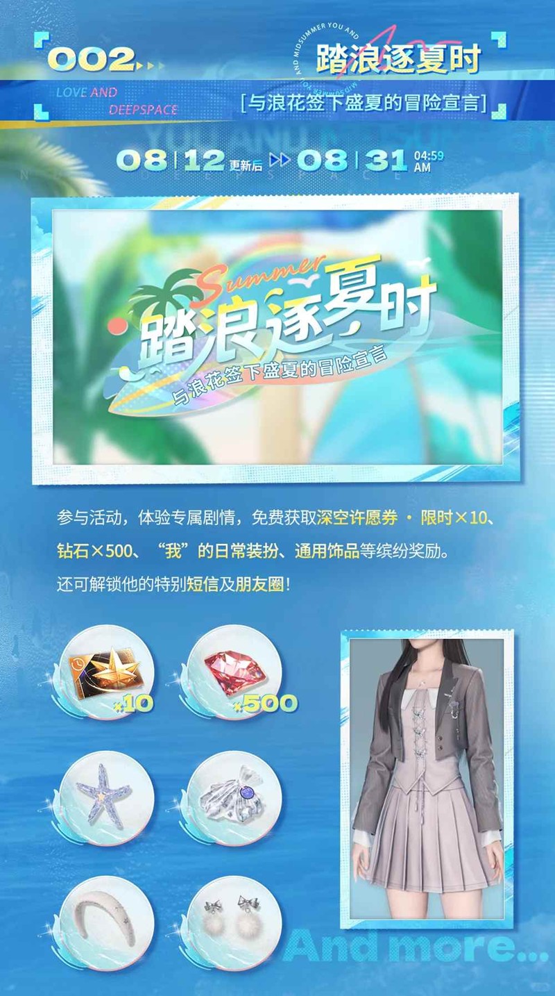「夏浪之约」活动同步开启,完成每日任务,获取全新写真布景、自选“我”的服饰套装、十连等多重奖励!