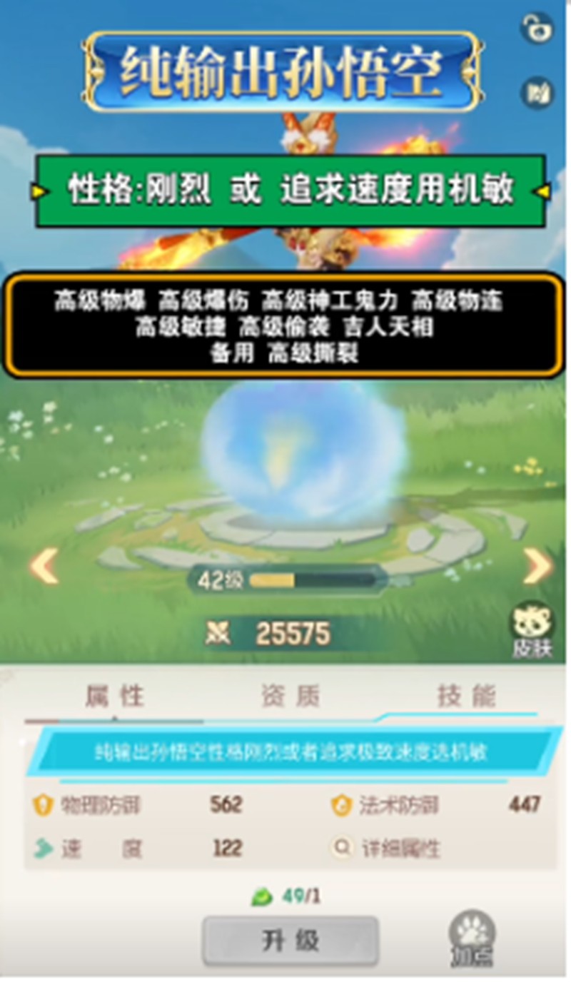 纯输出流孙悟空追求极限伤害,性格推荐刚烈提升10%暴击率或机敏增加10%速度。加点可以选择全武力最大化伤害,或者4力1敏兼顾输出和先手优势。核心技能除了保留高级物爆、高级爆伤、高级物连和高级神功外,还可以选择高级敏捷提升15%速度确保先手,高级偷袭忽视目标10%物理防御增强穿透效果。