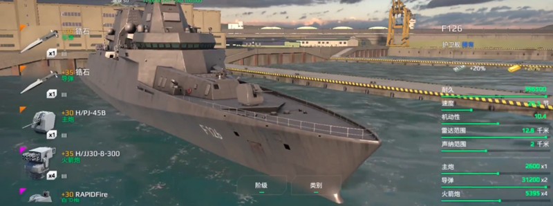 F126型护卫舰以凶猛的火力著称。装备的火箭炮配合A22型火箭,在近战时能形成密集火力网。该舰血量较高,特别适合冲锋突击战术。喜欢近距离搏杀的玩家可以考虑这艘战舰。